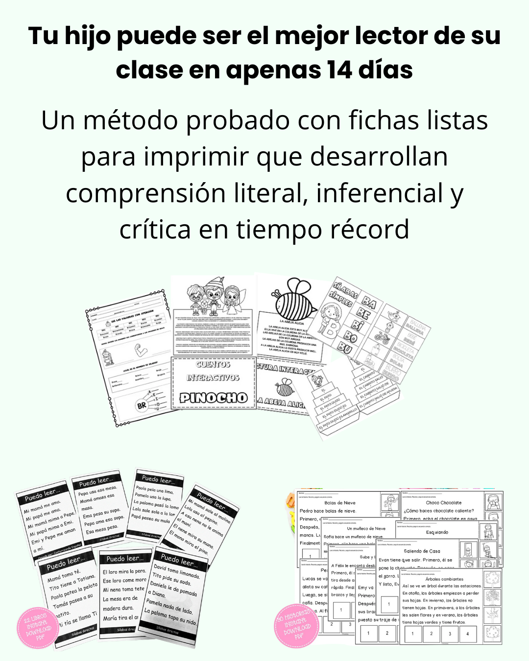 Materiales diseñados para mejorar la fluidez y la comprensión mediante lecturas piramidales y secuencias silábicas. Incluye cartillas de lectoescritura y ejercicios que guían al niño paso a paso en la construcción de oraciones de forma escalonada.